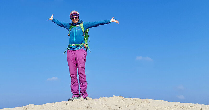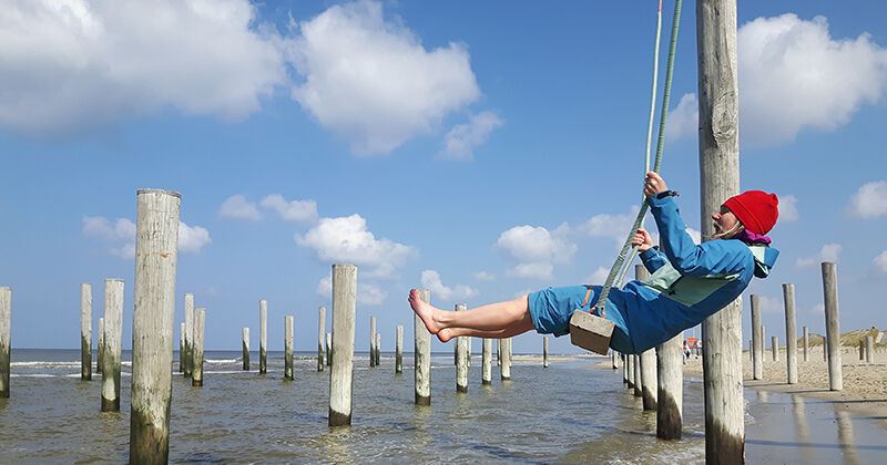 Ik plan graag een wandeltocht die eindigt bij het strand of een meer. Daar voel ik de ruimte en zie ik de horizon. Dat is niet alleen fijn als het warm is. Bij een woeste storm is het er vaak stiller en ruiger. Als ik er dan toch ben, neem ik vaak een frisse duik. Bij mooi weer, maar ook als het koud is. Niets zo verfrissend voor je lijf en je hoofd om rood en rillend uit het water te komen. Snel die warme kleren aan en beschut in een duinpan voel ik me dan enorm stoer. Ik neem altijd een thermosfles mee voor een kop warme chocolade. Je kunt natuurlijk op veel plaatsen zwemmen. Mijn favorieten zijn: het Nijkerkernauw bij een wandeling in het Horsterwold, de Noordzee bij het beklimmen van de duinen of het Henschotermeer in Den Treek. Maar bij mooi weer is elke sloot goed.