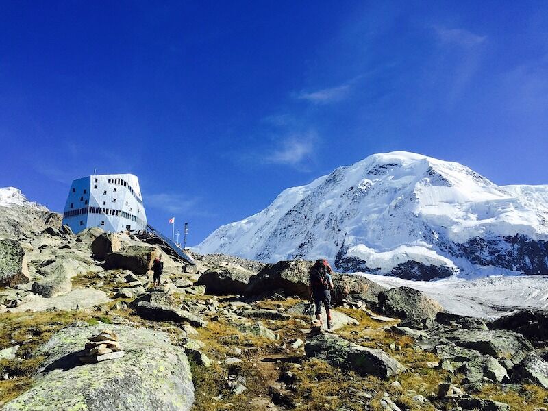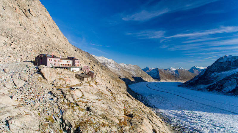 De Konkordiahütte ligt op 2850 meter hoogte in de Berner Alpen in Zwitserland. De hut is gebouwd op de rotsen en torent hoog boven het Konkordiaplateau uit. Op dit plateau ligt de Aletschgletsjer die bestaat uit vier kleinere gletsjers. De hut is dan ook een perfecte thuisbasis voor gletsjertochten. Bijzonder en zorgwekkend feit is dat de gletsjer gemiddeld een meter per jaar terugtrekt. Vroeger lag hij 50 meter onder de hut, tegenwoordig is dit 150 meter. Helaas de harde waarheid. Door de terugtrekkende gletsjer moet je eerst een 150 meter hoge trap beklimmen om de hut te bereiken. Een flinke workout dus voordat je op het terras kunt neerploffen. Maar het uitzicht maakt dit helemaal goed.