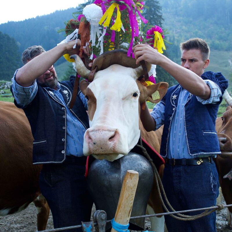 Ook de vrouw Jacques Ruffieux helpt mee en brengt kunstig versierde minikerstbomen. Dit zijn kleurige bloemen van crêpepapier in een boompje dat op een omgekeerd melkkrukje is gemonteerd. “Dat krijgen de koeien van Jacques morgen op hun kop, vastgesnoerd met leren riemen aan hun horens. En dan krijgen ze ook de zware feestbel om met een fraai versierde leren riem”, vertelt Peter. Na de grote schoonmaak gaat iedereen naar Tissiniva.