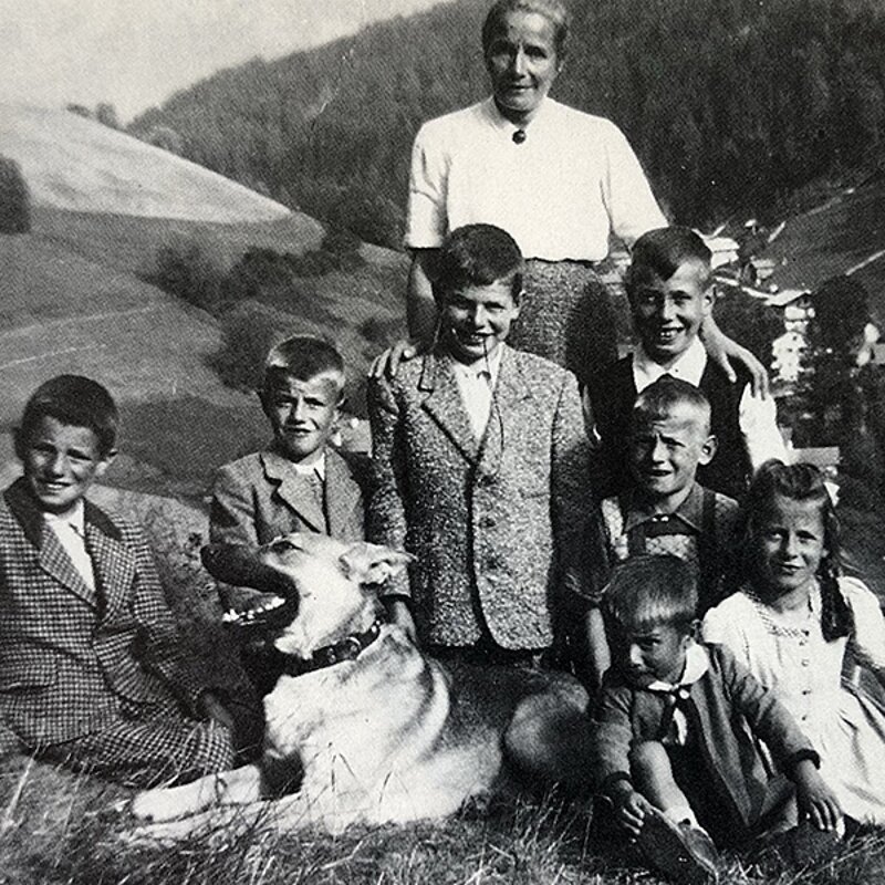 Beeld links: familie Messner. Moeder Maria Messner met zeven van haar acht kinderen, onder wie Günther (links), Reinhold (derde van links) en Hubert (vooraan).