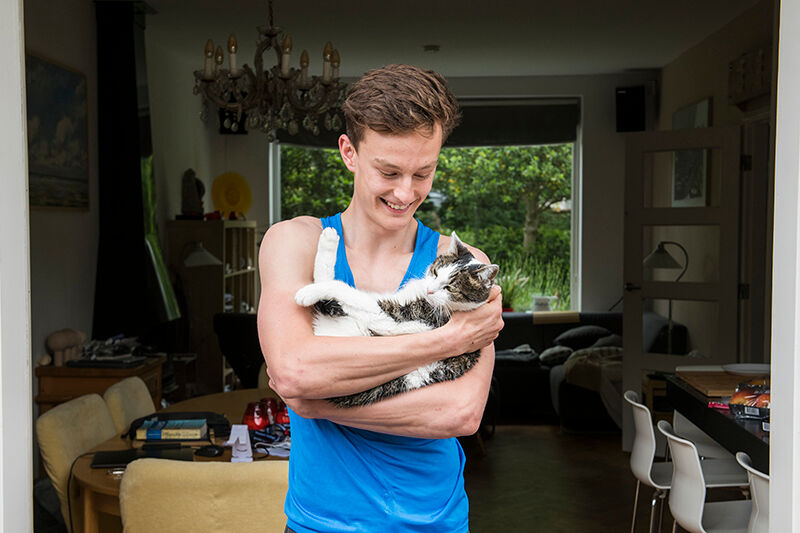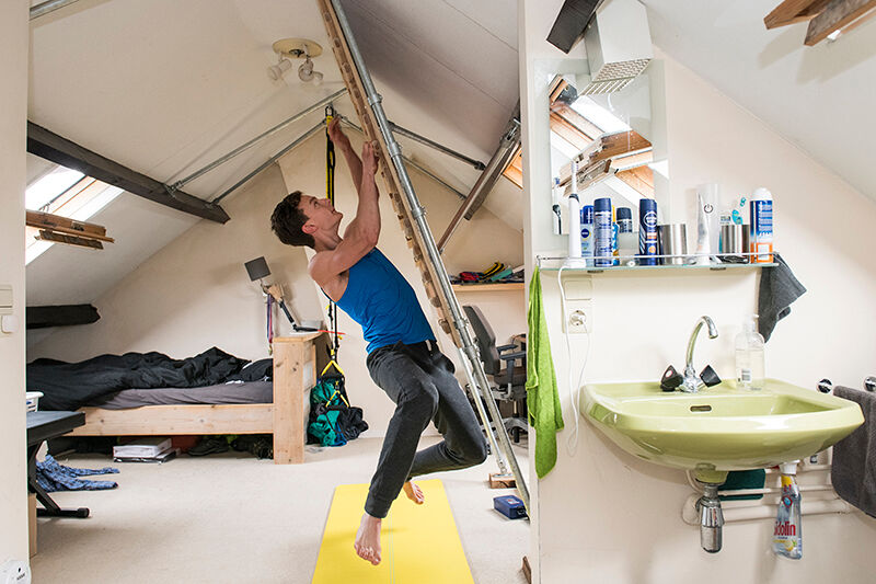 “Hierheen!” Mischa’s hoofd steekt uit het dakraam van een rijtjeshuis in Naarden. Een paar tellen laten opent hij al t-shirt aantrekkend de deur. Zijn ochtendtraining is net afgelopen. “Eigenlijk moet ik nu naar school”, lacht hij, “maar zo lang het met klimmen te maken heeft en ik goede cijfers haal, mag ik lessen missen. Zullen we buiten zitten? Boris (de dertienjarige kat die een poot mist) verliest zijn wintervacht, dus binnen liggen overal haren.“ Aan de tuintafel vertelt hij over zijn liefde voor klimmen.
