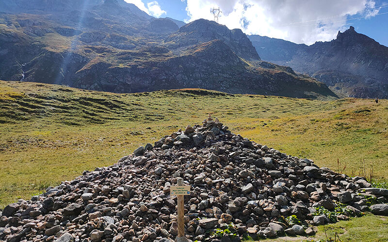 Op de route naar Col de la Croix du Bonhomme passeren we Tumulus Plan des Dames (2043 meter). Het verhaal gaat dat hier aan het einde van de 19e eeuw een Engelse dame is omgekomen en begraven. Om het kwaad af te weren, legt iedereen die haar graf passeert hier een steen neer.