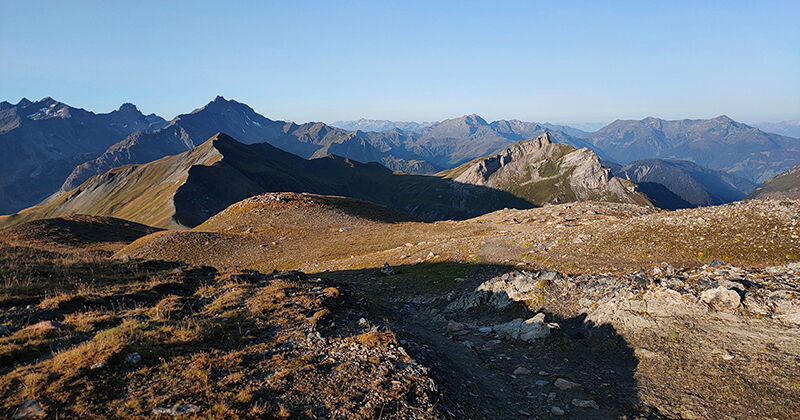 Vanuit de Refuge de la Croix du Bonhomme hebben we in de vroege ochtend prachtig uitzicht op het landschap. De opkomende zon legt de bergflank in een warme gloed. Mijn dag kan nu al niet meer stuk.