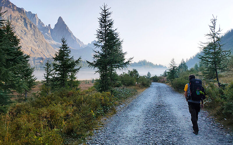 Na de Col de Balme gaat het slingerend naar beneden, het laatste stuk van onze Tour du Mont Blanc, naar de hut La Boerne in Argentière. Nog even blijven we op de col staan. Met zicht op de Mont Blanc mijmeren we over de afgelopen week. De route, de hutten, de mensen die we ontmoetten, het weer dat zo ontzettend meezat en het fantastische uitzicht.