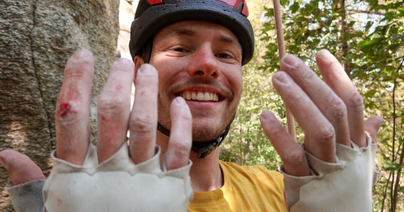 Bij spleetklimmen geldt: hoe beter je techniek, hoe minder pijn het doet. Maar ook met speciale spleethandschoentjes ga je waarschijnlijk toch nog een paar schrammen oplopen. Jules de Ruiter laat hier trots zijn oorlogswonden zien.