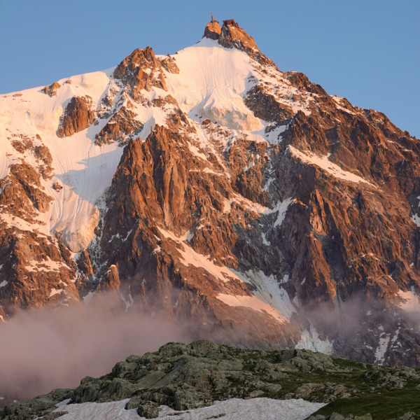 Voor ons verdwijnen onze teamgenoten (coach Bas en Maël, Jan en Folke) als mieren tussen de Franse touwgroepen. Laura maakt vaart en duikt er achteraan. Ze vindt een eenvoudigere route dan de Franse touwgroepen, maar inhalen lukt niet. Ik neem een moment om uit de gehaastheid van de route te stappen. Ik kijk om me heen en bewonder de eerste lichtstralen die 1500 meter lager op Chamonix vallen. Het uitzicht is adembenemend: het oranje ochtendlicht speelt met de schaduwen van granieten wanden om ons heen.