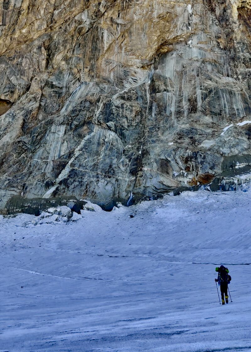 Na de eerste nacht op de gletsjer is het dan eindelijk zover en lopen we de laatste meters naar de rotswand. Op het moment dat we onder de wand staan, blijkt deze een stuk groter dan gedacht. Volgens onze planning klimmen we één dag in de rots en bereiken dan de sneeuw. Maar of we dat gaan halen?
