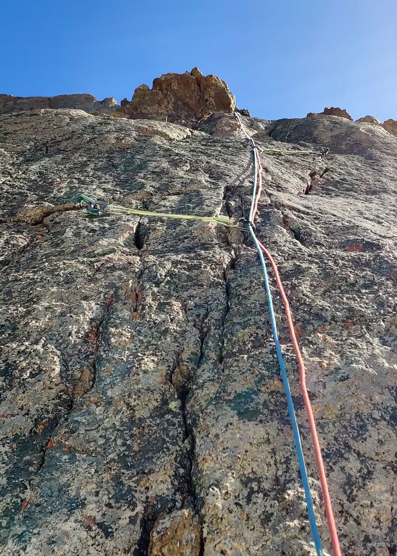 Aan het einde van de eerste dag klimmen wordt de rotskwaliteit zoveel slechter dat we beginnen te twijfelen of we wel door moeten gaan. Maar na de eerste nacht op een klein richeltje te slapen, worden we wakker met solide rots boven ons met daarin mooie cracks. Doorgaan dus.
