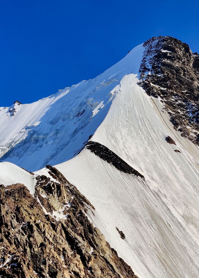 Met 600 meter rots achter de rug, ligt nu de laatste 400 meter ijs voor ons. Die begint met een vlakke graat, maar hoe dichter we bij de top komen, hoe steiler deze wordt. Net voor de top wordt het ijs nog even wat slechter, om het spannend te houden. Gaandeweg verandert het ijs in ongebonden grote sneeuw- en ijskorrels, waardoor we net voor de top nog een keer twijfelen om door te gaan, omdat er in deze sneeuw geen zekeringen te plaatsen zijn en het ook moeilijk afdalen is. Gelukkig is er meer naar rechts tussen de rotsen goed ijs te vinden om af en toe in te zekeren.