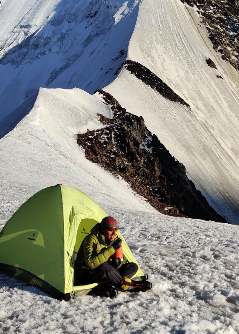 Na nog één keer van het uitzicht genoten te hebben, begint de terugweg. Bij de eerste abseil blijft het touw vastzitten, maar na wat gesjor, getrek en heen en weer klimmen kunnen we weer verder. Als we bij de tent op het sneeuwcolletje aankomen, is het al laat in de avond. Omdat onze afdaalroute steenslaggevoellig is, besluiten we nog een nachtje te slapen en dan in de ochtendkou verder ab te seilen.