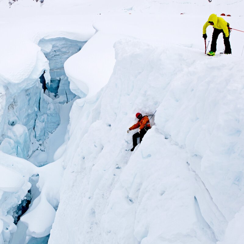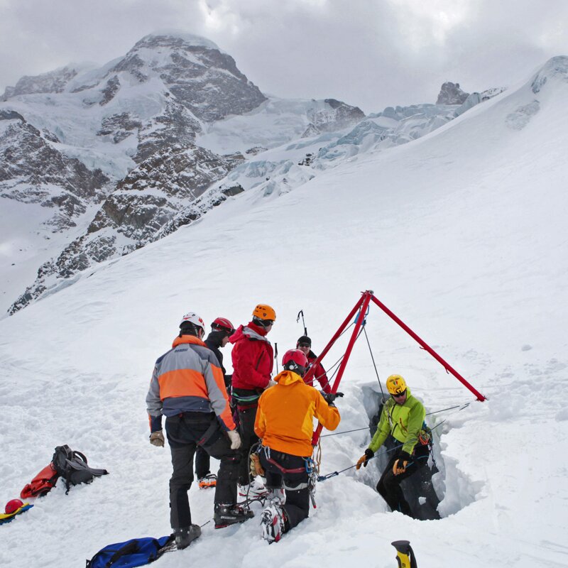 Mocht het niet lukken om zelfstandig uit de spleet te komen, dan kun je rekenen op reddingsdiensten die tot het uiterste gaan om je te helpen. Bekijk bijvoorbeeld deze reddingsacties op de Schwärze-gletsjer boven Zermatt of op de Vallée Blanche bij Chamonix. Niet zelden worden mensen pas na lange tijd uit hun miserabele positie bevrijd, zoals hier (na 15 uur) op Denali. In de Alpen zal in de meeste gevallen een speciaal ontwikkelde driepoot ingezet worden om in de spleet af te dalen. Dat kan natuurlijk alleen wanneer duidelijk is waar het slachtoffer zich bevindt. Ga daarom niet alleen op pad, behalve als je zoals Jost Kobusch volledig zelfredzaam bent. Niet iedereen kan immers op zoveel geluk vertrouwen als de man die een Spaltensturz op de Feegletsjer enkel overleefde dankzij de hulp van zijn trouwe viervoeter. Hoop heeft sowieso geen plek in risicomanagement. Beter zorg je voor een goede voorbereiding en ga je fit en geoefend op pad. Maar, laten we vooral niet vergeten: ook bergredders vermaken zich in hun vrije tijd graag met gletsjerskiën. Op eigen kracht omhoog vellen, op de top genieten van het uitzicht en daarna met vrienden samen door de majestueuze bergwereld naar beneden suizen... dat is simpelweg subliem!