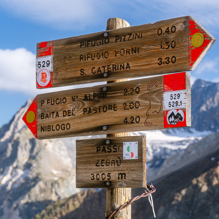 Het is alweer dag vijf als we flink wat kilometers door het Zebru-dal maken richting het dorpje Sant’Antonio. Het pad slingert op en neer langs steile bergflanken over een prachtig stenen pad. De paden zijn hier smal en de afgronden steil. Gelukkig is het pad niet technisch, maar je wilt hier absoluut geen misstap maken. We lopen richting de prachtige berghut Quinto, die op een stenen heuvel ligt met het mooiste uitzicht over de omringende bergen. Na een espresso – altijd goed in Italië – dalen we af. Eerst richting Rifugio Campo, waar je ook kunt overnachten, en dan naar het dorpje. We zijn er bijna, maar niet voordat we een enorme plens water over ons heen krijgen en een harde klap horen. Regen en onweer dus! Nadat ik mijn backpack binnenstebuiten heb gekeerd (na al die zon lag mijn regenjas helemaal onderop – nooit handig), rennen we door het struikgewas naar een houten hutje, waar we schuilen. Vijf minuten later is de kust weer veilig en dalen we verder af naar het dal, waar we overnachten in Albergo Zebru. Het is fijn om weer even in de bewoonde wereld te zijn en wat inkopen te doen bij de lokale supermarkt en een frisse douche te nemen!