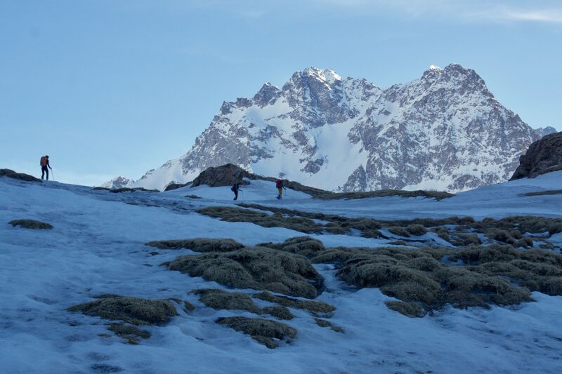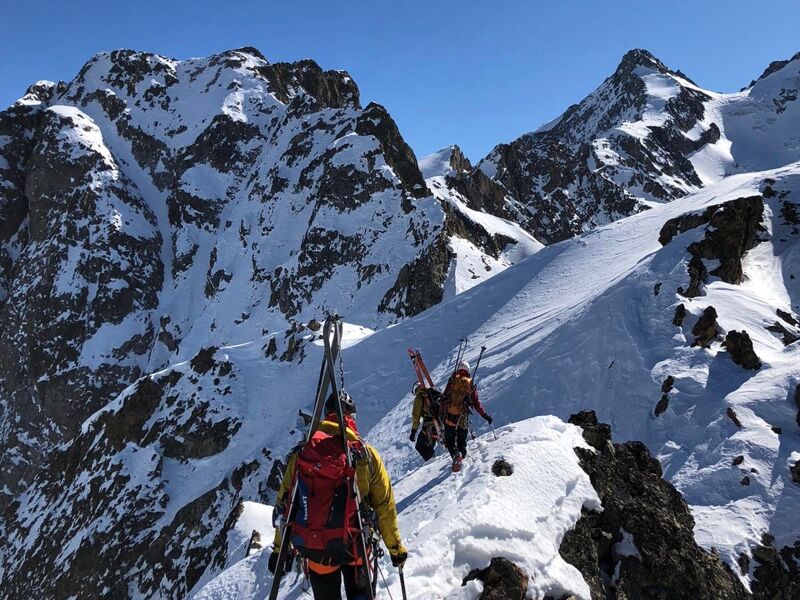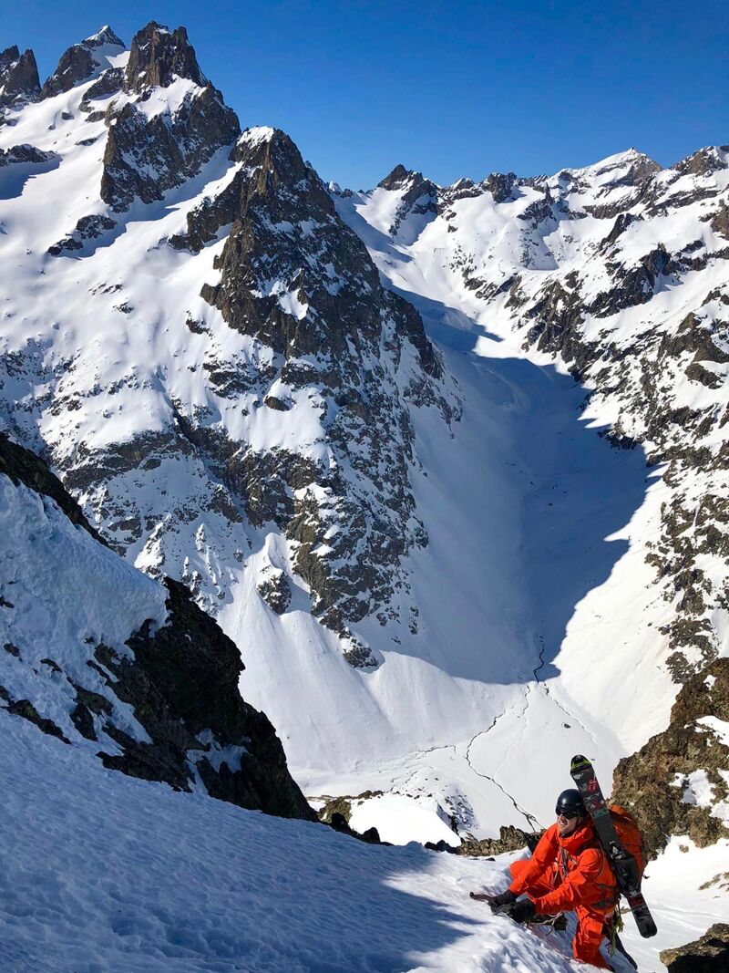 Met het scherpe oog van Michiel kozen we een wand die op het noordoosten lag en alleen wat ochtendzon kreeg. Dwars door de wand naar de Pic W de Chamoissière loopt het Véronique-couloir, waardoor we onze weg naar boven moesten vinden. Na een vroege start en een paar uur omhoog vellen kwamen we aan bij de rotsige instap. De ski’s werden op de rugzak gebonden, want na de topgraat naar de Pic de Chamoissière zou een mooie afdaling op ski’s te doen zijn.