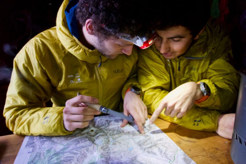 Ik gooi de vijf wollen dekens van me af, trek mijn skischoenen aan en stap naar buiten. Er staat een ijzig windje, maar de hemel is kraakhelder. Het licht van de maan schijnt op de steile bergen, die wit zijn van de sneeuw. Ondertussen wordt binnen in het winterhutje boven Villars d’Arène de Jetboil aangestoken om water te koken voor de thee en een ontbijt. Met hoofdlampjes op onze hoofden en dampende mokken voor onze neus worden we langzaam wakker.