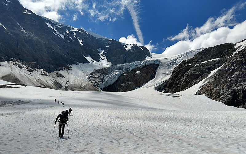 Hoe ziet een gemiddelde dag er voor jou uit als je een tocht leidt voor Bergsportreizen? Ben van oorsprong altijd een vroege vogel geweest en dat past goed in de Alpenlanden. Tijdig opstaan en de verse sneeuw en ijs voelen voor het gaat smelten en dan weer op tijd in de hut. Lekker op het terras met een Alpenbiertje in goed gezelschap. Ik sta dan op rond een uur of vijf of zes afhankelijk van mijn planning voor de dag. Dan volg ik een vaste routine: snel mijn spullen pakken, insmeren met zonnebrandcrème en vervolgens een stevig ontbijt. Daarna een check of iedereen goed geslapen en gegeten heeft en klaar is voor de dag. Het laatste weerbericht bekijken en dan beginnen. Tijdens onze tocht zorg ik altijd voor voldoende rustpauzes met een goede maaltijd en drinken. Ik reserveer in de weekplanning een relaxtere dag (meestal rond de vierde of vijfde dag) waarin we uitgebreid kunnen pauzeren en genieten van de Alpen zon.