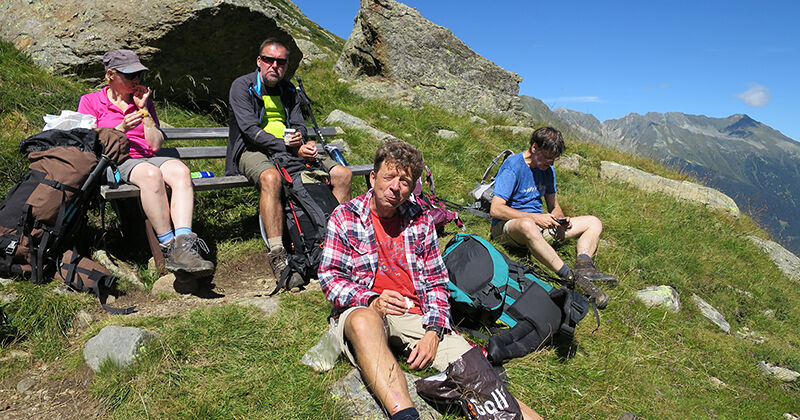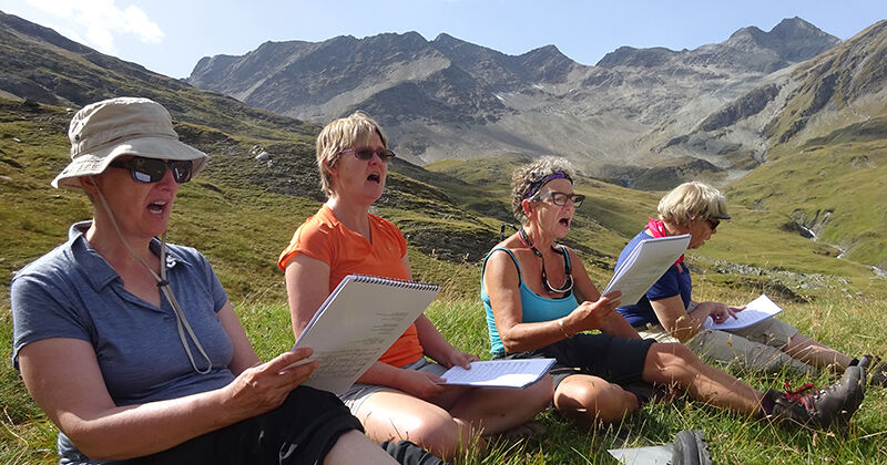 Van de andere kant kan ik ook enorm genieten van de alpenweitjes en van de mooie paden net boven de boomgrens. Een dagtocht hoeft niet per se lang en zwaar te zijn. Zo heb ik een paar jaar geleden een nieuw soort huttentocht bedacht waarin ik twee van mijn hobby’s combineer: zingen en wandelen. In 2017 hebben we voor het eerst dit project ‘Zingen op de alp’ gedaan. Het was een 7-daagsde lichte huttentocht in Oostenrijk voor mensen die net als ik houden van meerstemmig zingen. Ik deed dat samen met de dirigente van mijn koor in Amsterdam. Ieder dag namen we een aantal keren de tijd om een uurtje te oefenen of een lied te zingen voor passerende wandelaars. Soms bij een meertje of een bergbeek, vaak ook bij de hut. Het was bloedje mooi weer, we hebben zelfs gezongen bovenop de Donnerstein. Het is leuk als er van iedere stemgroep twee zangers zijn, dus volgende keer graag een paar extra mannen. Overigens staat ‘Zingen op de Alp’ in 2021 opnieuw op de rol, dan in de Allgäuer Alpen.