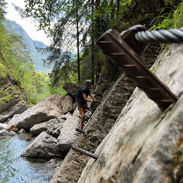 Op zoek naar leuke klettersteigs kom ik al snel bij de Pirknerklamm Klettersteig uit, een route die door een prachtige, waterrijke kloof slingert. Het idee om deze kloof op deze manier te ontdekken, maakt me meteen enthousiast. We volgen de bordjes rechts langs het huis richting de Alte-Mühle, waar de klettersteig begint. Al snel hoor ik het geluid van stromend water. Het eerste deel van de route leidt ons over grote rotsblokken. Onderweg komen we vier touwbruggen tegen. Hoewel ze niet erg lang zijn, voegen ze een leuk element toe aan de tocht. Vervolgens klimmen we steil omhoog langs de 'Rainbow Falls'. Ik hoop op een glimp van een regenboog, maar helaas blijft de lucht grijs en bewolkt. Na de waterval vervolgt de route links langs het water, waarna we de beek oversteken naar de rechterkant. Hier wacht ons een licht overhangende passage, gevolgd door een traverse. Het einde van de klettersteig is nu in zicht; alleen nog een trappetje van beugels beklimmen en we zijn er. Daarna volgen we een smal bospaadje omhoog en dalen we weer af.