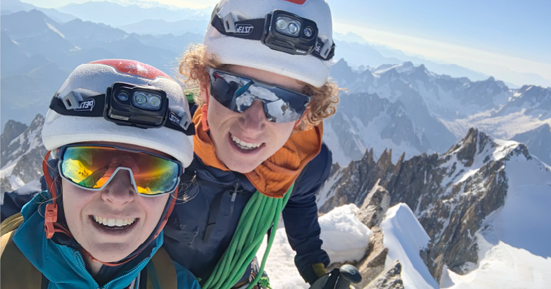 Uit onze voorbereiding wisten we dat we aan het eind van de tocht nog een lange, geëxponeerde sneeuwgraat over moesten. Aan het begin van de sneeuw flank vinden we een mooi plateautje, door eerdere klimmers uitgegraven. We besluiten daar even te rusten en te ‘blockloaden’ – een ritueel waarbij we in recordtempo een paar cliffblocks naar binnen werken. De suiker en cafeïne geven ons de energieboost die we nodig hebben, dankjewel Buitensportvoeding.nl! Met nieuwe energie beginnen we aan de sneeuwgraat. Ik keek hier best wel tegenop, maar als we het hoekje om klimmen, ziet het terrein er een stuk eenvoudiger uit dan gedacht, en we bewegen snel richting de top. Om 08:30 staan we boven, anderhalf uur sneller dan verwacht. Door onze energiepiek en het enthousiasme overwegen we zelfs door te klimmen naar de top van de Mont Blanc. Jan is nog vol energie, en hoewel ik de moeheid voel, doe ik het graag voor zijn oma. Ze had ons namelijk gisteren nog enthousiast gevraagd of dat ons doel was. #MakeOmaProud
