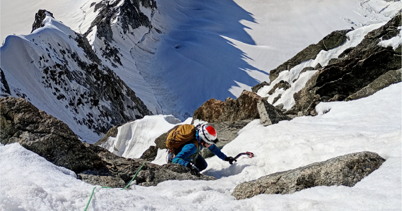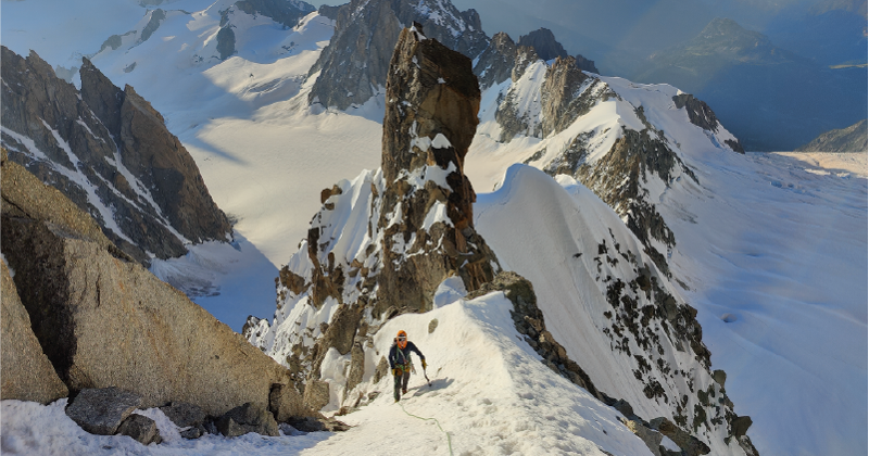 Rustig klimmen we verder over de sneeuwpassages, afgewisseld met een stukje mixed terrein en wat rotsen. Deze route biedt echt alles, precies de stijl waar ik het meest van houd. Vandaag nemen we bewust de tijd om het uitzicht in ons op te nemen. Vanaf de demi-lune passage hebben we een spectaculair zicht op de route van gisteren. De zonsopkomst transformeert de lucht in een canvas van roze en blauw, en het is doodstil om ons heen. Het contrast met de drukte van gisteren is enorm, we zijn helemaal alleen! Dat is zeldzaam op zo’n populaire route in Chamonix.