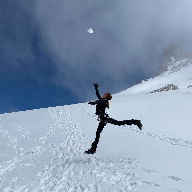Ook maken we een wat langere tocht. Om 7 uur vertrekken we om een besneeuwde bergtop te beklimmen. We rijden een uurtje en nemen vervolgens de kabelbaan naar 3200 meter hoogte. We lopen alle andere toeristen voorbij en binden ons dan in aan het touw. De sneeuw is geweldig, het uitzicht fantastisch. Als we bij een steil, spannend stuk met een enorme gletsjerspleet aankomen is iedereen enorm gefocust en tegelijkertijd ook aan het genieten. Eenmaal op de col besluiten we dat het ons eindpunt is. De rotsgraat naar de top is goed te doen, maar niet met zes man in een touwgroep. Een andere keer dan maar. We bouwen sneeuwpoppen, spelen in de sneeuw en dalen niet veel later weer af.