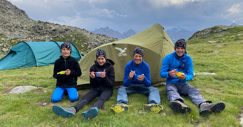 Tijdens onze vakantie gaan wij meestal een nachtje bivakkeren. Redelijk makkelijk te organiseren en avontuur is gegarandeerd. Een meertje met een bergbeekje is de grootste speeltuin voor jong en oud. Daar slaan we onze tenten op en houden we wedstrijdjes met stokjes en blaadjes. Ook stenen ketsen blijft lang leuk. Na het op de brander bereide driegangenmenu (spaghetti, nootjes en Saroma) lopen we nog naar een klein topje. Helaas, ook op de top vinden de pubers geen bereik, maar wel een prachtige zonsondergang. Onderweg zien we ook nog eens bergmarmotten en gemzen!