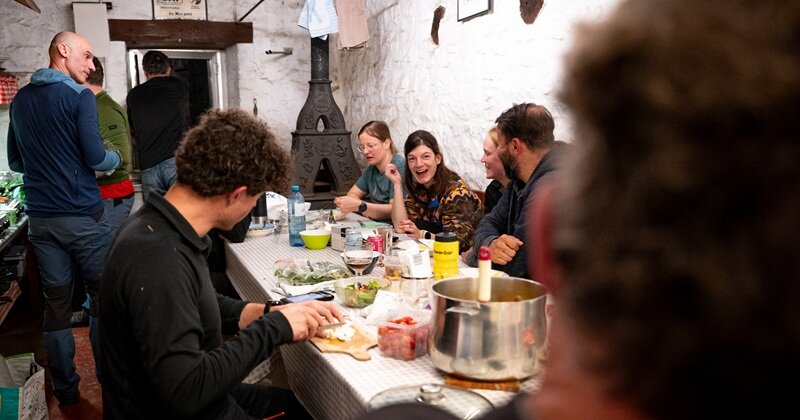 Eenmaal binnen in de Samson Hut wordt met zijn allen gekookt, afgewassen, drankjes gedeeld en spelletjes gespeeld. Met het haardvuurtje aangestoken door Wouter, de man die het ons mogelijk maakt er te verblijven, is naast de sfeer ook de hut warm. Mensen bespreken in de groep hun eigen ervaring met het klimmen. Laten elkaar gemaakte foto’s zien en blikken terug op de eerste dag. De groep ziet elkaar voor wie die is en helpt bij tegenslagen met bemoedigende woorden.