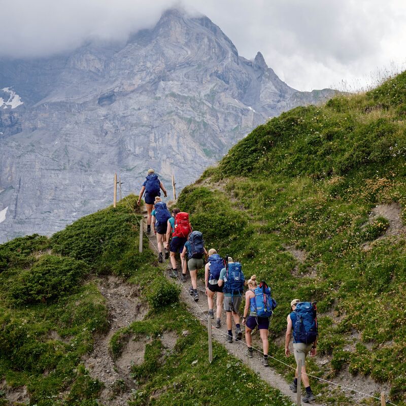 Onze tocht start in Lauterbrunnen. ‘s Ochtends reizen we met een bus naar het bergdorp Isenfluh (1081 m). Net onder restaurant Waldrand stopt de bus en begint onze tocht. Vanuit Isenfluh pronkt direct een mooi uitzicht over het Lauterbrunnental en op de indrukwekkende wanden van de Eiger, Mönch en Jungfrau. Een adembenemend plaatje, de tocht kan beginnen. Via een steile weg lopen we langs de laatste huizen van Isenfluh. De huizen maken al snel plaats voor de frisse bosgeur en naaldbomen aan onze zijde. Stukje bij beetje worden de bomen dunner en komen we boven de boomgrens op een alm uit, waar ons pad verder langs de Sulsbach loopt, richting een alm-boerderij waar elke dag verse kaas wordt gemaakt. Mocht je nu al een opkikker nodig hebben? Dan moet je de boer even lief aankijken en wie weet krijg je een vuistje kaas.
