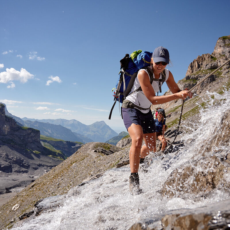 De oorspronkelijk route is op de Sefinenfurgge links omhoog, via deze route zou het nog ongeveer 1,5 uur naar de Gespaltenhornhütte zijn. Deze route wordt afgeraden voor ons als onervaren bergsporters. De berggids besluit een andere pad te nemen. Hierdoor zijn we ruim 3,5 uur extra onderweg. Vanaf de Sefinenfurgge dalen wij af naar Bürgli en vanaf daar nemen we weer het pad omhoog richting de Gespaltenhornhütte. Ondanks de pittige tocht levert het een spectaculair uitzicht op. Onder ons aanschouwen we de Gamchigletsjer en de indrukwekkende wanden van de Wildi Frau, Morgenhorn en Gspaltenhorn. Na een knik in het pad en een uitdagende doorsteek door de rivier zien we de Gspaltenhornhütte (2455 m) op afstand liggen tegen de machtige en massieve wanden van de Gspaltenhorn. Door de flinke omweg komen wij veel later aan dan verwacht maar de prestatie geeft ons een onwijs goed gevoel en was het meer dan waard.