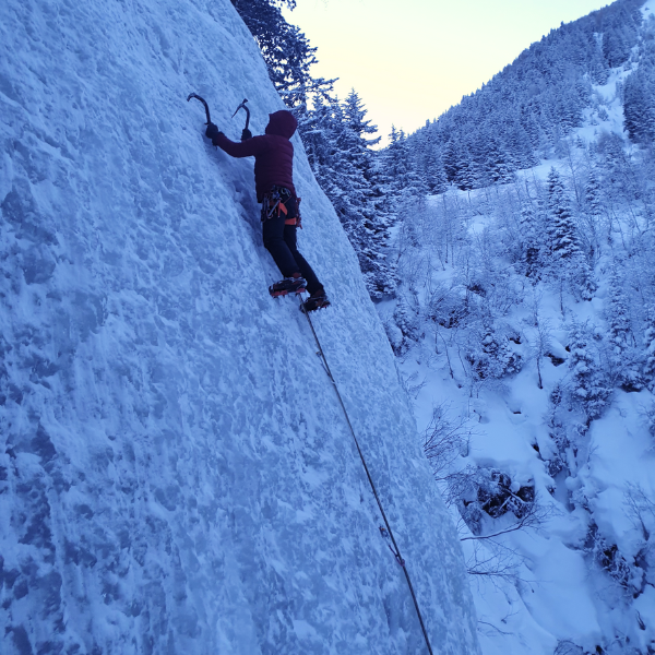 Nadat we mooi op tijd aankwamen in Innsbruck zijn we gelijk naar de Taschachschlucht gegaan, een ijsklimtuin in het Pitztal. Deze lag er super bij, met een temperatuur van -15Co was er een zee aan ijs. Aangezien Jan en Jules nog nooit ijs hadden geklommen en het voor Laura een lange tijd geleden was, begonnen we met wat oefeningen en uitleg. Toen de basics er een beetje in zaten was het tijd om te klimmen. Na wat ongemakkelijke eerste meters groeide het vertrouwen in de bijlen en stijgijzers. Het verbaasde de beginners hoe subtiel je moet zijn voor een sport die er zo bruut uitziet. Met het laatste licht werden nog wat eerste voorklimmeters gemaakt, iets wat met ijsklimmen soms best spannend kan aanvoelen.