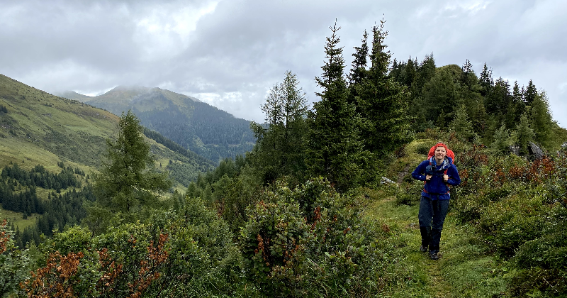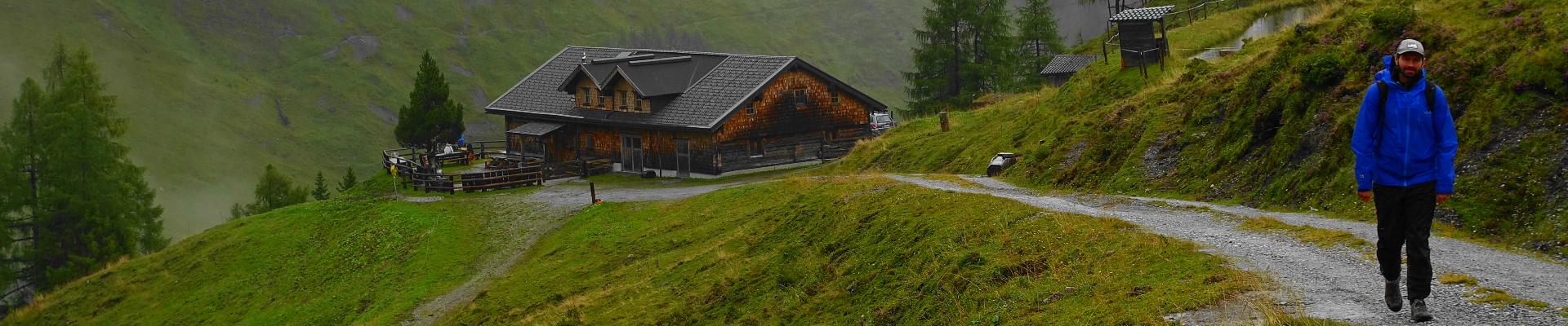 Na een kritische blik op onze lichte A-schoenen en lachend commentaar “dat wordt natte voeten!” van Taxi Rudi worden we afgezet bij Unterberg, de start van de Gastein Trail. Gehuld in volledig Goretex pak, alles in de rugzak in drybags en een regenhoes zetten we de eerste stappen. De dag ervoor zijn we in de watten gelegd in Aktivhotel Gasteiner Einkehr. Als we bij aankomst mensen in dirndl, lederhose en indrukwekkende krulsnor zien weten we dat we in Oostenrijk zijn. We voelen ons koningen te rijk met halfpension en we kijken met gezonde spanning uit naar onze 6-daagse wandeling.
