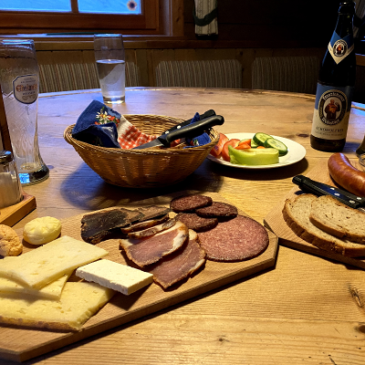 Druipend, met een modderspoor achter ons, lopen we de Heinreichalm binnen. We worden hartelijk begroet door de familie die hier 3 maanden per jaar woont. De houtkachel heeft de eetzaal heerlijk warm gemaakt en binnen no time liggen onze schoenen te drogen, staat er een Weizen voor onze neus en wordt er Käsespätzle en soep voor ons gemaakt op de houtkachel. Dit is het goede leven! Die avond maken we kennis met de Jause. In de almen is het niet gebruikelijk om s’avonds een driegangenmenu te eten, zoals ik dat ken van de Oostenrijkse berghutten waar ik ben geweest tijdens mijn alpiene curssusen, maar eten ze hier ’s avonds een Jause. Dat is een plank vol met lekkernijen die ze in de Alm maken: verschillende soorten kaas en (gerookt vlees) met wat brood erbij.