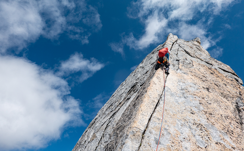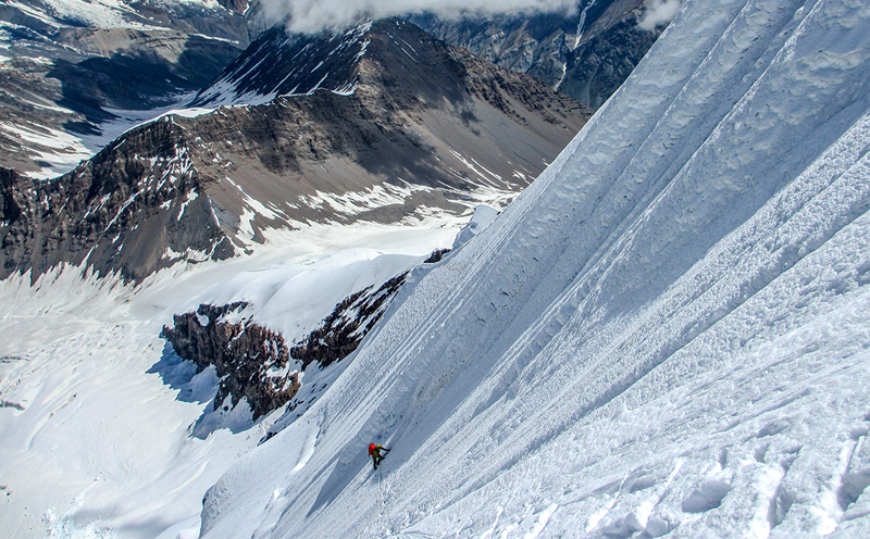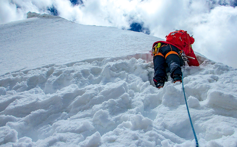 Bas volgt tijdens een spannende passage tijdens de eerstbeklimming van Kachqiant (6015m) in 2018. Het is hard werken op 5500m De lucht bevat veel minder zuurstof en ik draag hier een rugzak van 16 kilo. Foto: Danny Schoch.