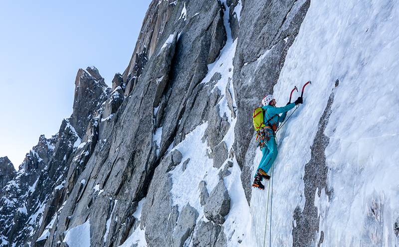 Voor ijs- en mixed klimmen moet je super sterke kuiten hebben. Line laat zien hoe het moet in de 85 graden steile crux van Fil a Plomb in Chamonix! Foto: Bas Visscher