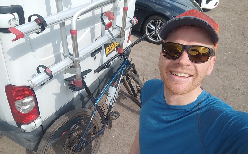 Bas is klaar voor een lange mountainbiketocht op de Lage Vuursche in het voorjaar van 2022. Foto: Bas Visscher