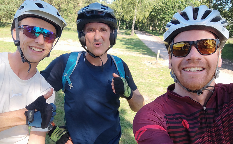 Tijdens een mountainbiketraining in Leersum en Amerongen met Dennis (links), Court (midden) en Bas (rechts) wordt de conditie nog even getest…. Foto: Bas Visscher