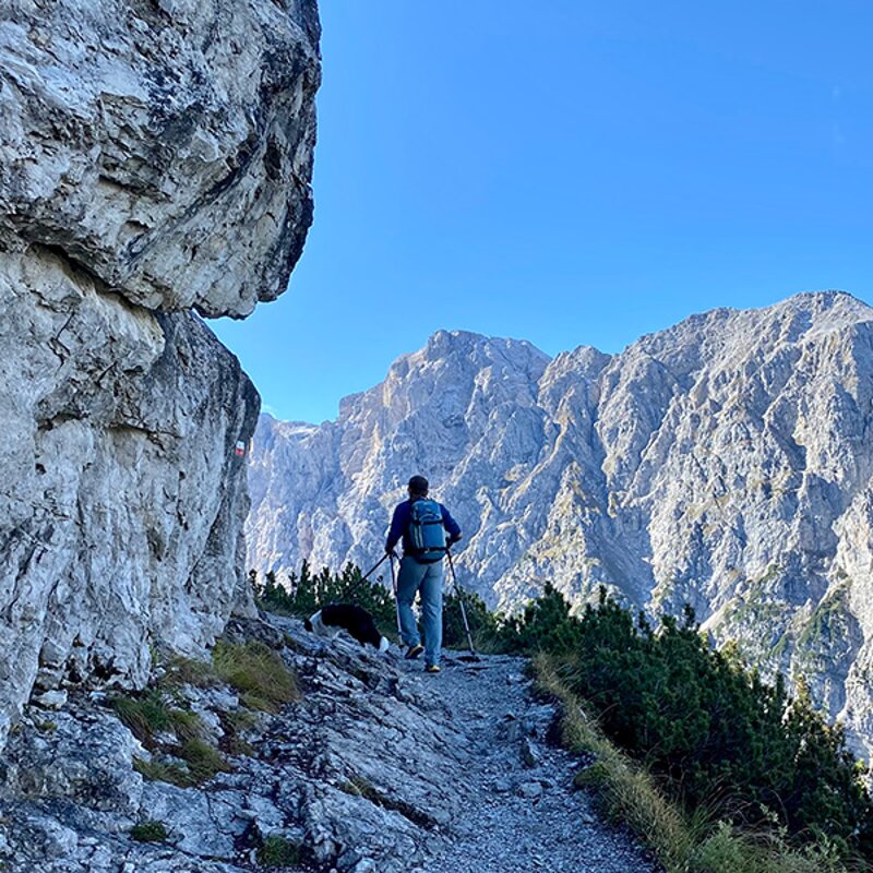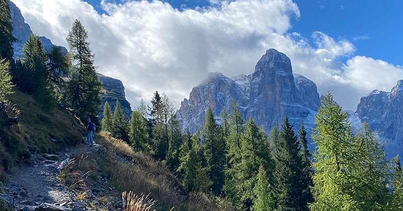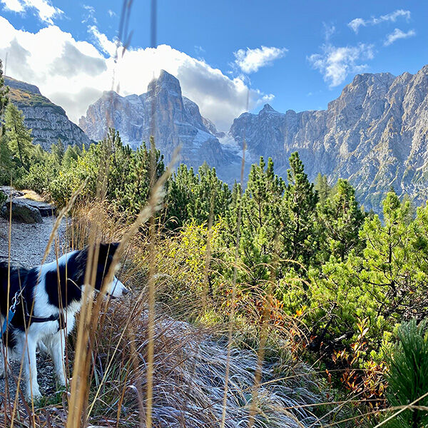 Dit keer geen sneeuw maar een frisse septemberochtend met welgevormde regen- en dauwdruppels op het groen langs het wandelpad welke ik start vanuit in Madonna di Campiglio. De stenen zijn glibberig en de route gaat direct steil omhoog zodat langzaam ‘inlopen’ niet aan de orde is. Houthakkers zijn bezig om flinke stammen naar beneden te takelen en na een korte groet concentreer ik mij direct weer op het pad. Ik zigzag door het bos omhoog terwijl zonnestralen proberen een weg door het bladerdak te vinden. Sneller dan verwacht, sta ik voor de berghut Rifugio Casinei (1825m) waar het licht brandt. Ik heb nog geen behoefte aan koffie en besluit door te lopen. Ik haal diep adem als ik meer uitzicht krijg…. En wat voor één; de Brenta Dolomieten met een laagje poedersuiker van de afgelopen nacht en een diepblauwe hemel waarin de zon voorzichtig hoger klimt. Lykke, mijn hond, heeft direct mijn aandacht als ik een stukje koek uit mijn rugzak haal. Met een kop thee erbij geniet ik met haar van dit fraaie panorama.