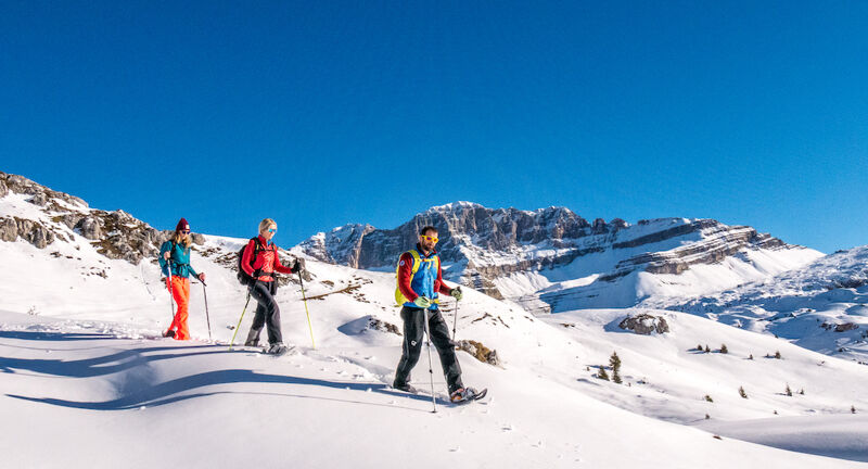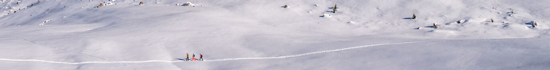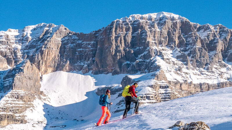 Afdalend laten we al snel de drukke skipistes achter ons. Door de hoogte is de temperatuur laag en begeef je je de verse poedersneeuw. Met de sneeuwschoenen blijven we als het ware drijven op de sneeuw. Voor ons zien we de loodrechte rotswanden van de Punte di Campiglio (2876 m) en de afgeplatte Cima Falkner (2990 m). De laatste is vernoemd naar Alberto Falkner, die in 1882 de officiële eerstbeklimming op zijn naam zette. Waarschijnlijker is het dat plaatselijke jagers al veel eerder op de top stonden, maar zij hebben nooit de moeite genomen dat te laten vastleggen.