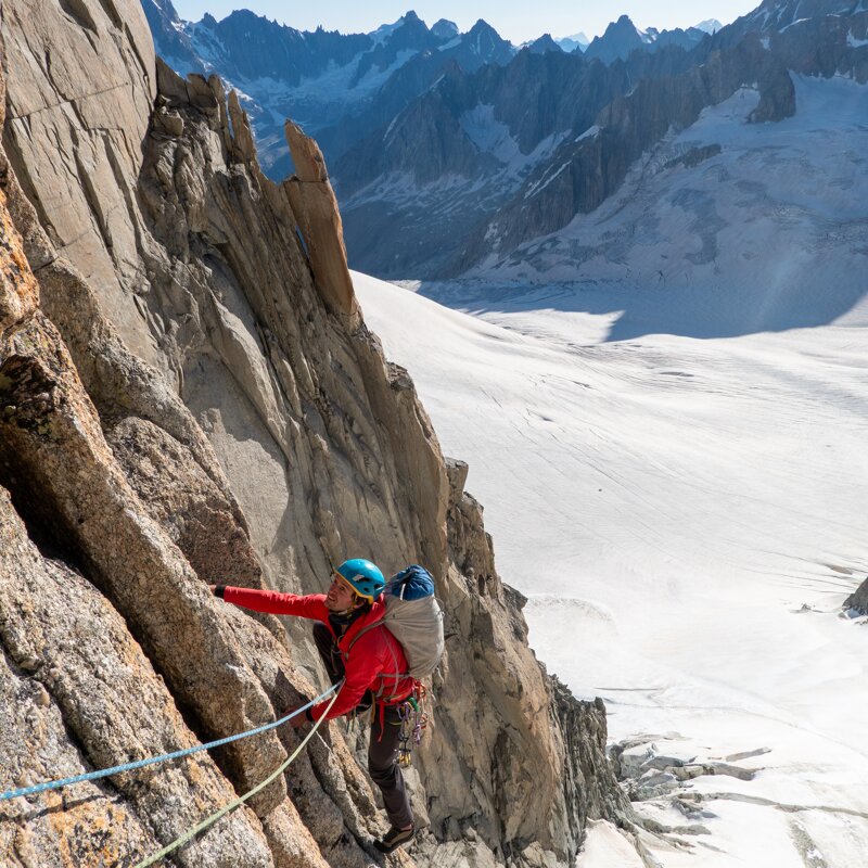 Thibaut klimt met dubbeltouw in de Gervasutti pijler (800m, 5c) op de Mont Blanc du Tacul. In een hoogalpiene route met kans op steenslag kan een dubbeltouw verstandig zijn. Mocht één touw geraakt worden door een steen, dan heb je altijd nog het andere touw. Foto: Bas Visscher.