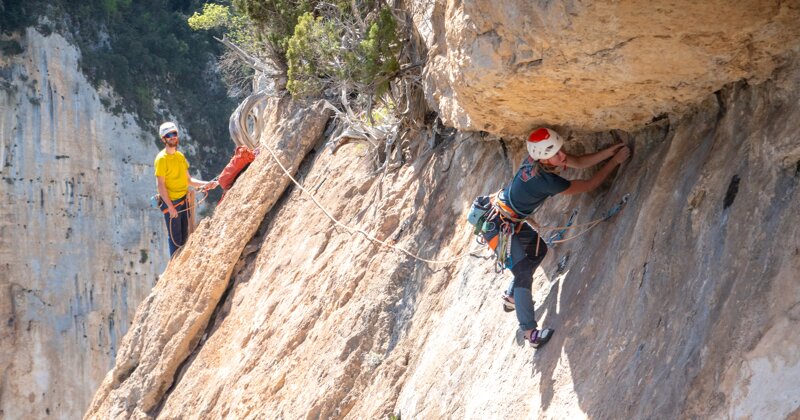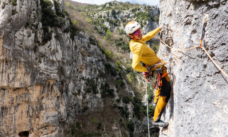 Maël Durand in een 6c-lengte in de Verdon. Als voorklimmer klimt hij zonder rugzak. Hij heeft een rapline (een dun touw) aan zich hangen om de haulbag te takelen. Hiermee kan zowel de voor- als naklimmer zonder zware rugzak klimmen. Foto: Bas Visscher.