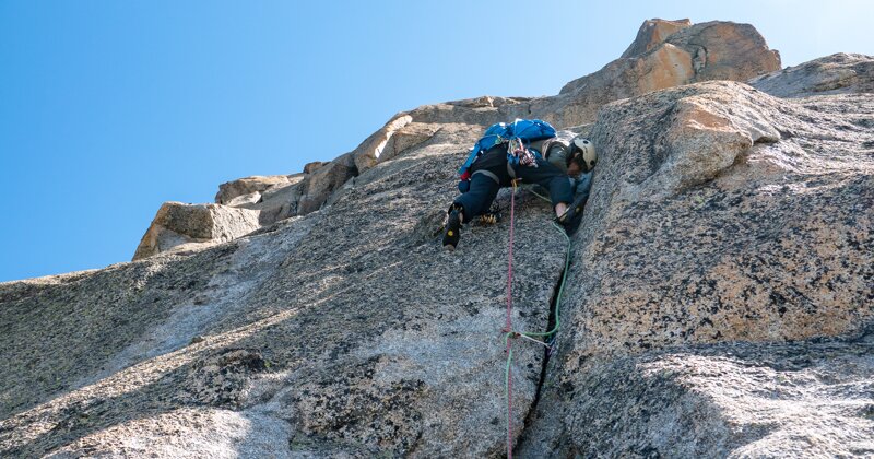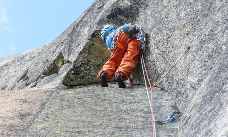 Ik raad aan om goed na te denken over je strategie met je rugzak of haulbag als je een moeilijke multi-pitch gaat doen. Zeker een zware rugzak kan een enorme belemmering vormen in een lastige lengte.
