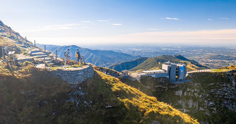 Als je hier dan toch bent, dan kun je niet om het imposante bouwwerk Fiore di Pietra heen, dat als een surrealistisch ruimteschip boven op de top staat. Na een bezoekje aan de tentoonstelling over de geschiedenis van de spoorweg vervolg je je wandelroute en kom je aan bij de Alp Clericetti waar je een perfect uitzicht op de Valle di Muggio hebt, de meest zuidelijke vallei van Zwitserland. Vervolg het pad naar beneden tot je weer in Bellavista bent aangekomen. Daar neem je de trein weer terug het dal in.