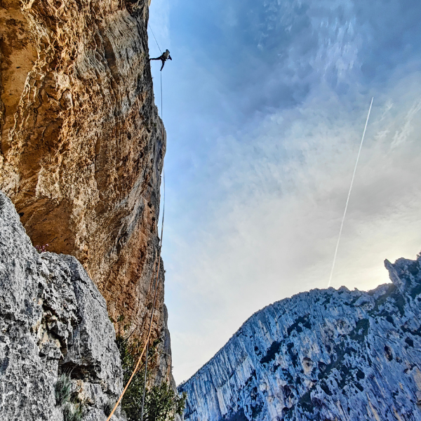 Hoewel er hier toch verrassend veel spleetgeklommen kan worden, staat de Verdon bekend om zijn loodrechte en spiegelgladde platen. Jan en ik (Folke) kiezen er daarom voor om ook een dag ons (laten we eerlijk zijn, vooral mijn eigen) niveau te testen in een technische route op deze platen. We kiezen de route Barbapoupon, een 6b+ op de 'hoofd'wand, recent opnieuw behaakt door de campingbaas die ons wederom enthousiast vertelt over de verschillende touwlengtes.