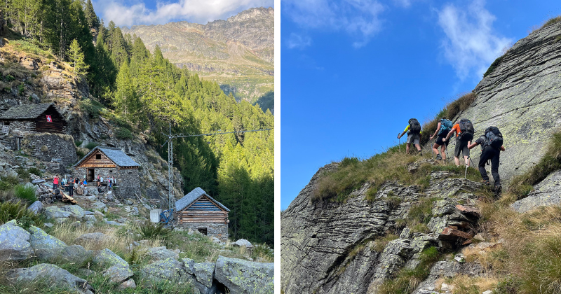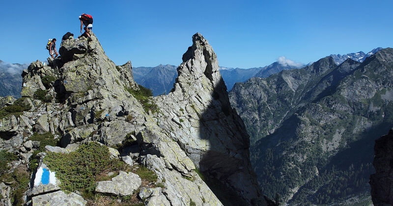 Vandaag wacht een uitdagende etappe. Vanuit Spluga klim je naar de Pascolo dei Laghi en de Bocchetta del Sasso Bello, waarna je het Lavizzaradal binnen stapt. De steile afdaling en instabiele ondergrond vragen om voorzichtigheid, vooral in grotere groepen. Via een uitgestrekt blokkenveld bereik je de Cima di Broglio, gevolgd door eenvoudigere klauterstukken en een spectaculaire luchtige passage met kabels. Daarna volgen nog steenvelden en gladde platen met extra beveiliging. Via de goed uitgeruste Valle dei Pini stijg je e naar de Passo di Chènt. Een complexe afdaling brengt ons in de Val Tomè. Na uren in ruig terrein duikt eindelijk een klein druppelvormig meertje op. Niet veel verder ligt de Capanna Tomeo, waar een warme maaltijd en een bed op je wachten.
