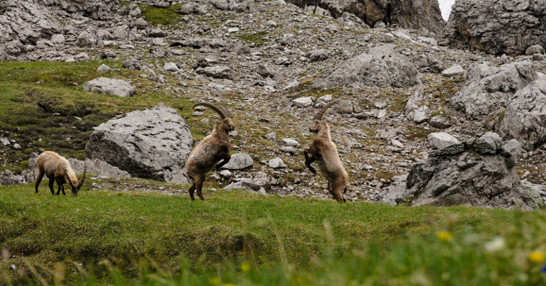 De volgende ochtend sluipen we muisstil de achtpersoonskamer uit. De ochtendmist lijkt op te klaren, dus we trotseren meteen de steile klim naar het Gufelseejoch. Daar trekt de laatste nevel weg. Achter het diepblauwe meer verrijzen de bergen zover we kunnen kijken. Langs de oever van het meer lopen steenbokken. Ze springen van de ene naar de andere rots en balanceren op kleine richeltjes. Zodra we in het gras gaan zitten, beginnen ze met elkaar te stoeien. Klak-klak! Het houterige geluid van de horens die elkaar raken, wordt weerkaatst tegen de rotswanden. Het kost ons moeite verder te wandelen, maar er liggen nog zeven pittige kilometers voor ons.