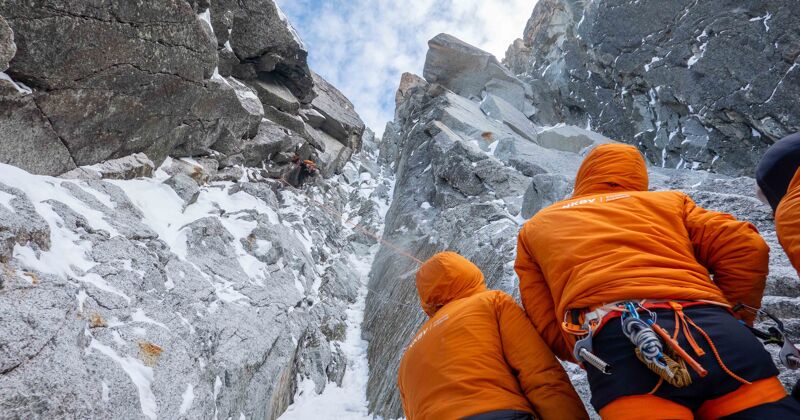 Terwijl Team Frendo na uren ploeteren in heupdiepe sneeuw moest omdraaien, worstelden wij juist met rots die te droog was. Zowel Jules als ik waagden ons aan de vierde lengte, maar het kleine beetje ijs dat er nog was werd met elke angstige slag minder, laat staan dat het genoeg was voor een ijsboor voor de gewilde zekering. De twijfel sloop in. Was dit het moment om al het verstand overboord te gooien en zonder goede zekeringen en op je limiet door te klimmen? Nee — dat is niet waarom we hier zijn.