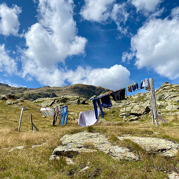 Helaas is het vandaag slechts een dagtocht maar de omgeving is inderdaad schitterend en zou zeker de moeite waard zijn om een aantal dagen in rond te trekken. Onze knorrende magen roepen ons tot de orde en we lopen terug naar de hut. Het schone wasgoed wappert aan de waslijn terwijl gezinnen picknicken op het grasveld eronder. Een geelgouden Radler smaakt goddelijk en de stevige maaltijd doet de rest, we komen weer op krachten. Immers, de afdaling wacht op ons, en gezien de gemaakte 1.000 hoogtemeters, staan mijn knieën niet direct te springen. Omdat ik foto’s en video’s wilde maken, heb ik geen stokken meegenomen waar ik nu toch wel spijt van heb. Zigzaggend over het brede pad omlaag met de zon op onze bol is de vermoeidheid steeds meer voelbaar. Ook de koeien laten merken dat de dag lang was en liggen herkauwend onder de bomen en ons geen blik waardig gunnend. Ik opper om bij de Malga de shuttlebus te nemen, maar daar aangekomen blijkt deze pas over een half uur te komen. We beslissen wel wat frisdrank te nemen alvorens het laatste stuk aan te gaan. Er wordt weinig meer gezegd; we concentreren ons op losliggende stenen en boomwortels en slaken alle drie een zachte zucht van verlichting als de parkeerplaats in zicht komt. Schoenen uit en slippers aan waarna we nagenietend van al het natuurschoon Val di Rabbi en Val di Sole achter ons laten.