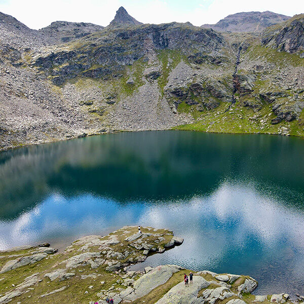 Grote rotsblokken, beekjes links en rechts en plots staan we voor één van de vijf Corvo meren. De wolken weerspiegelen in het water en ik ontdek kikkervisjes die langs de oever verstoppertje spelen. Sandra roept dat het grootste meer vlakbij ligt en op een grote rots genieten we van deze parel op 2.461 meter hoogte. Ik laat de drone opstijgen en krijg zo een nog beter beeld van deze meren en de omgeving. Sandra vertelt de mogelijkheden als je hier verder wandelt richting Val di Pejo of Val d’Ultimo (Ultendal).