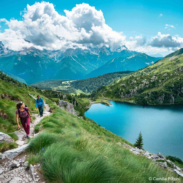We bevinden ons hier tevens op de grens van twee provincies; Trentino en Alto-Adige (Zuid-Tirol). Dat is te zien aan de bewegwijzering die tweetalig is (Duits en Italiaans) en ook aan de architectuur van de hut. De meren liggen iets verderop en we beslissen deze eerst te bezoeken waarna we bij de hut iets zullen eten.