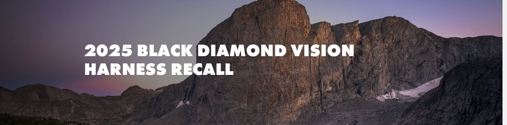 Black Diamond Equipment roept de Vision klimgordel terug vanwege voortijdige degradatie van de een deel van de materialen en constructie. Dit kan leiden tot een risico op ernstig letsel of overlijden. Consumenten die het Black Diamond Vision-harnas bezitten, moeten het onmiddellijk niet meer gebruiken en de terugroepprocedures volgen.