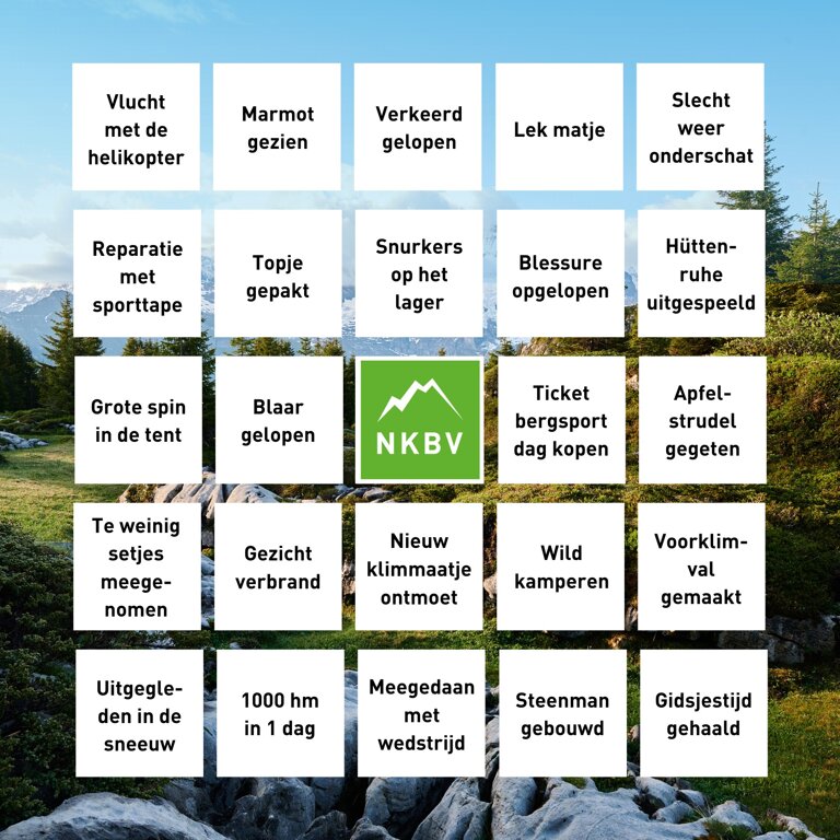 Tijdens een huttentocht, een bergwandeling, een klimtrip of een cursus maak je van alles mee. Hoe leuk is het als je deze typische momenten kunt afstrepen op een Klim- en Bergsport bingokaart? Want wie mag er nou bingo roepen met een verbrand gezicht, met een blaar onder zijn voet of een na het uitspelen van de Hüttenruhe?